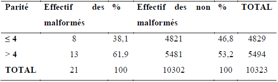 Le tableau suivant montre la survenue d’une malformation congénitale et parité.