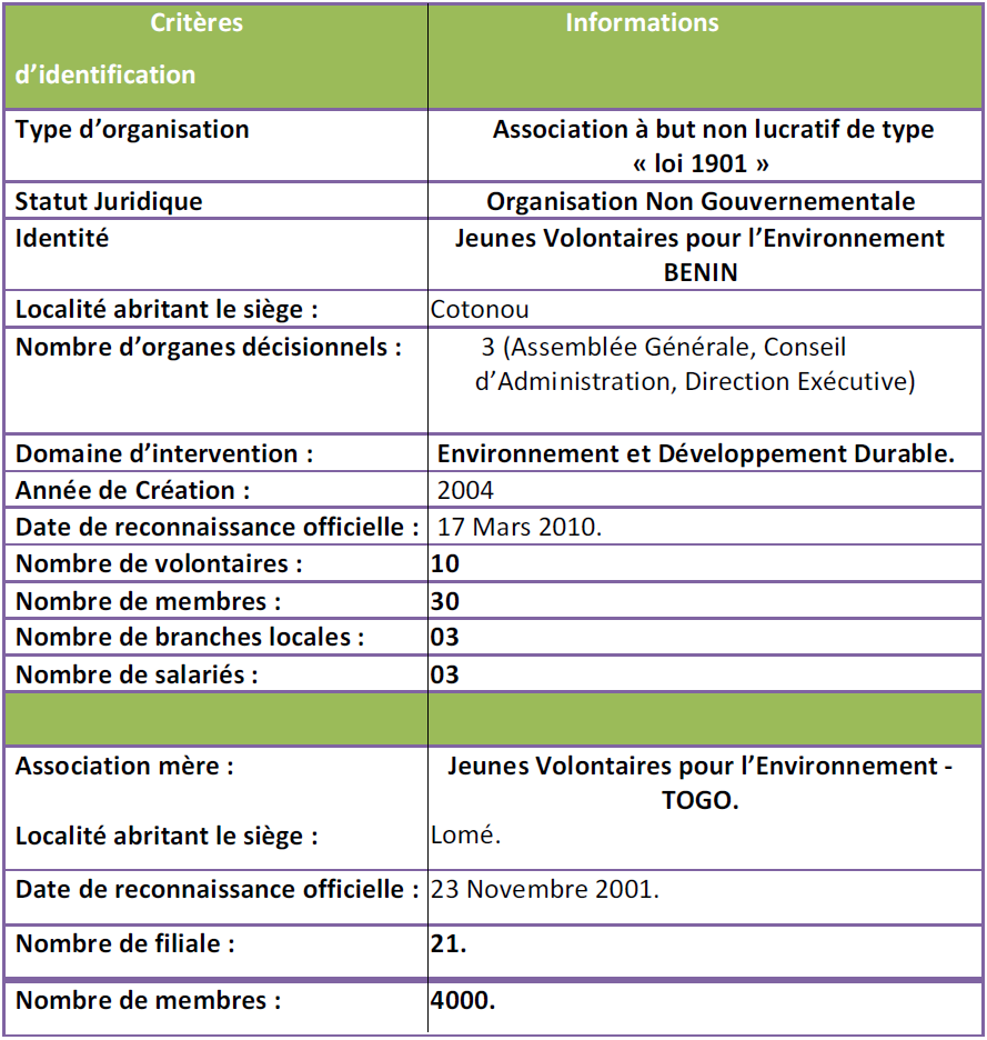 L’ONG Jeunes Volontaires pour l’Environnement est une organisation à but non lucratif de type Loi 1901 qui joue un rôle déterminant dans les processus de développement durable sous toutes les formes. Elle est basée essentiellement sur l’aspect de volontariat associatif qui oblige les membres à s’investir pleinement pour la bonne organisation et le déroulement des activités sans une quelconque contrepartie financière. En vue de mieux réaliser ses activités, elle fait souvent recours aux partenaires techniques et financiers pour un soutient et accompagnement dans les missions de développement durable.