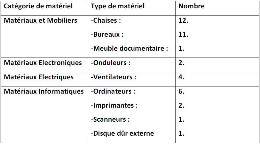 Comme dans toute organisation, les ressources matérielles de JVE BENIN sont ceux qui sont mis à la disposition des travailleurs pour qu’ils fournissent leur prestation de travail en guise du respect de leurs engagements. Au cours de cette expérience professionnelle, les premiers travaux effectués nous ont permis de faire un inventaire des outils de travail dont les résultats sont les suivants :