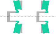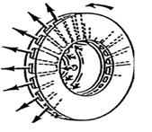 La figure I.17 représente deux types de disque ventilé. Le modèle « a » présente une moins bonne ventilation que le « b », mais possède une meilleure rigidité. La figure I.17 montre également la déformation du deuxième type de disque soumis à un fort gradient de température. La rotation du disque entraîne une circulation d’air dans les canaux [3], d’où une amélioration du refroidissement (Fig. I.18).