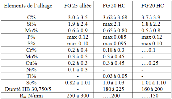 Les fontes à forte teneur en carbone sont aussi les matériaux les plus couramment utilisés dans l’industrie automobile, le tableau ci-après donne les compositions des alliages en fontes (FG) destinés à la fabrication des disques de frein.