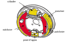 Il se compose d’un tambour en fonte solidaire de la roue, de mâchoires solidaires du châssis, garnies d’un matériau à haute résistance au frottement et à l’échauffement et d’un cylindre qui presse les mâchoires contre le tambour (Fig.I.2). Les mâchoires sont en acier recouvert d’une garniture d’un matériau composite ayant un bon coefficient de frottement (0,35 à 0,40) avec le matériau du tambour et s’usant plus vite. L’usure peut être rattrapée par un mécanisme de réglage accessible de l’extérieur (non automatique) [2].