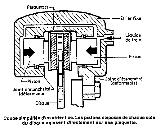 Dans le cas de l’étrier fixe, qui est rigidement attaché à l’essieu et qui comporte deux pistons opposés alimentés par un même circuit hydraulique, les deux pistons viennent presser les deux plaquettes sur le disque lors de la mise en pression (Fig. I.13). L’avantage de ce dispositif par rapport à l’étrier coulissant est la moindre quantité de liquide mise en jeu (puisque chaque piston ne parcourt qu’une demi-distance).