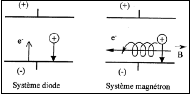 Dans le procédé diode, la cible crée elle-même son plasma et attire les ions qu’elle avait engendrés. Dans le système de pulvérisation triode, les fonctions de création et d’utilisation des ions sont séparées.