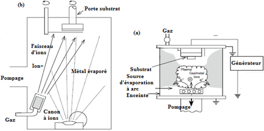 Quant au plasma réactif, il est employé pour générer des espèces qui réagissent avec les particules évaporées pour former un composé. Ceci mène à des couches uniformes et non poreuses. Dans cette technique de dépôt ionique, le substrat peut être positionné dans la région de génération du plasma ou dans un emplacement distant. La figure I.8.a montre une configuration de bombardement ionique à base de plasma à l’aide d’une source d’évaporation à arc.