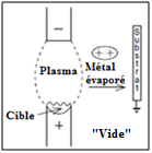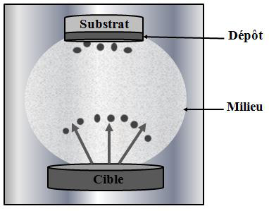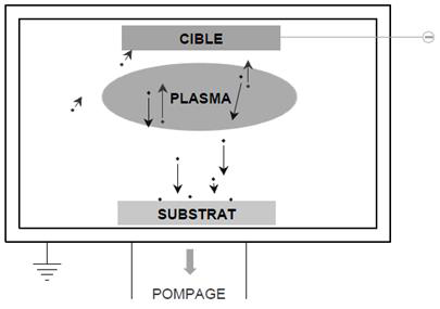 La pulvérisation d’un matériau cible est gouvernée par des phénomènes électrochimiques. Les atomes de la cible sont éjectés dans un gaz ionisé (inerte ou réactif). Sous une pression dans l’enceinte, le champ électrique créé par une haute tension entre les deux électrodes conduit à l’ionisation du gaz introduit formant ainsi un plasma. Les ions présents dans le plasma sont attirés par la cathode, et par transfert de quantité de mouvement éjectent des atomes de la cible. Les particules pulvérisées sont en général électriquement neutres. Elles sont diffusées dans toute l’enceinte. Un certain nombre d’entre elles sont recueillies sur le substrat, sur lequel elles forment une couche mince. Donc le plasma, appelé aussi la décharge luminescente [1], est la base de la pulvérisation cathodique. La pulvérisation par un gaz réactif sous vide (pression d’environ 10-3 Pa) est souvent utilisée pour les dépôts de composés tels que les nitrures, les carbures, les oxydes, et les sulfures.