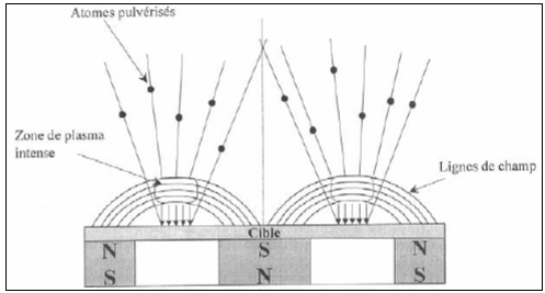 Ce type de procédé constitue une évolution de la pulvérisation cathodique classique. Originellement, la pulvérisation cathodique était surtout utilisée pour la microélectronique, mais grâce à l’apport du procédé magnétron, cette technique est maintenant aussi utilisée pour des applications mécaniques ou électriques. Dans le cas de l’utilisation d’une cathode magnétron, un champ magnétique orienté perpendiculairement au champ électrique (parallèle à la cathode) est créé par des aimants placés aux alentours du métal. Il permet ainsi de confiner les électrons au voisinage de la cathode (figure I.6). Les électrons s’enroulent autour des lignes de champ magnétique (figure I.7), augmentant considérablement les probabilités d’ioniser une molécule de gaz ce qui permet d’accroître le taux d’ionisation du gaz. Un schéma du dispositif est présenté dans la figure suivante :