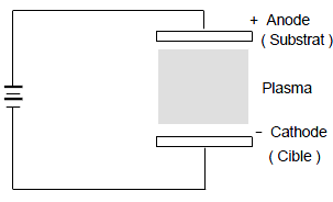Le plasma est créé par une décharge électrique dans le gaz introduit entre deux électrodes (figure I.4) : une cathode (cible) et une anode (porte-substrat).