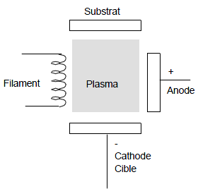 L’ensemble constitué par le filament, l’anode et la bobine est un dispositif générateur de plasma indépendant de la cible et du substrat. Cette indépendance de la cible par rapport au plasma fait qu’il est possible de déplacer la cible au-dessus de l’anode ou lui donner n’importe quelle forme (ce qui n’est pas le cas avec des procédés diodes). Le substrat lui aussi peut être déplacé à volonté et se présenté sous n’importe quelle forme.