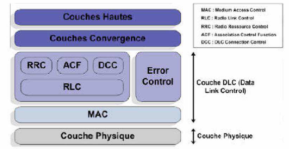 ~ La couche RLC (Radio Link Control) à laquelle sont associées les entités de signalisation suivantes : DCC (DLC Connection Control), RRC (Radio ressource Control) et ACF (Association Control Function) ;