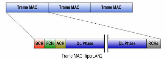 Broadcast Channel (BCH) : dans le sens descendant seulement, ce canal contient les informations de contrôle envoyées à chaque trame MAC à tous les TM. Ces informations sont entre autre les puissances de transmission utilisées, la longueur des canaux FCH et RCH, ou les identifiants du réseau et du PA. Frame control Channel (FCH) : dans le sens descendant seulement, cette partie contient la description exacte de la façon dont les ressources (champs DL,