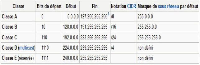 • La classe E : le premier octet a une valeur comprise entre 240 et 255, il s’agit d’une zone d’adresses réservées aux expérimentations. Ces adresses ne doivent pas être utilisées pour adresser des hôtes ou des groupes d’hôtes.