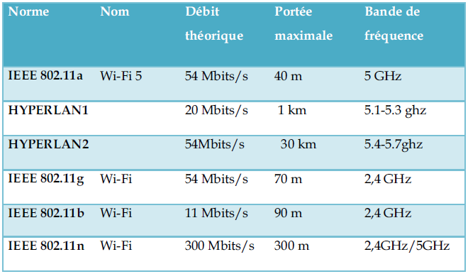 Ce tableau ci-dessous nous montre de façon bien précises et détaillées les différentes normes existantes de L’HYPERLAN :