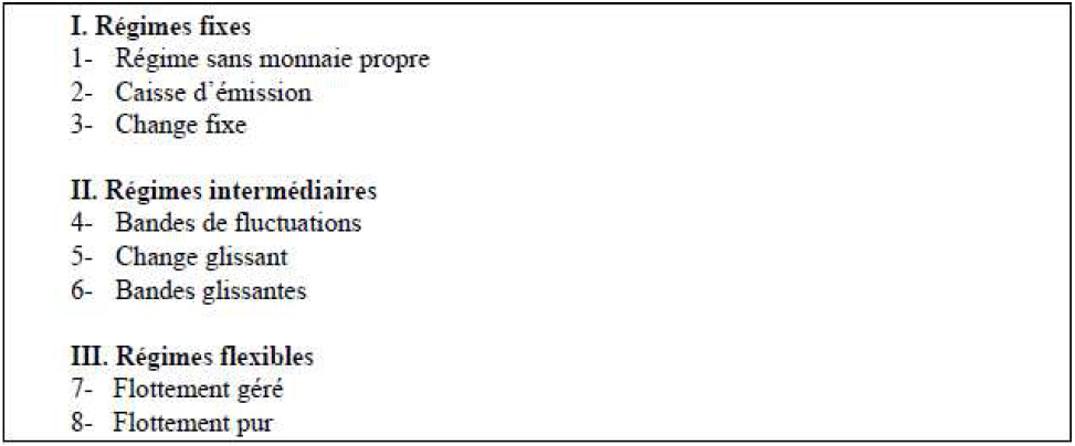 Le régime de change se définit comme l’ensemble des règles qui déterminent l’intervention des autorités monétaires sur le marché des changes, et donc le comportement du taux de change. Il existe une grande variété de systèmes de change allant du libre flottement à la fixité extrême. Ces régimes sont généralement regroupés en trois grandes catégories : les régimes de change fixes, les régimes de change intermédiaires et les régimes de change flexibles. La séparation entre ces trois groupes n’est pas toujours évidente (Obstfeld et Rogoff, 1995) dans la mesure où, un même régime intermédiaire peut être considéré suffisamment flexible pour être classé dans les régimes flexibles ou assez rigide pour être classé comme fixe (Frankel,2003).