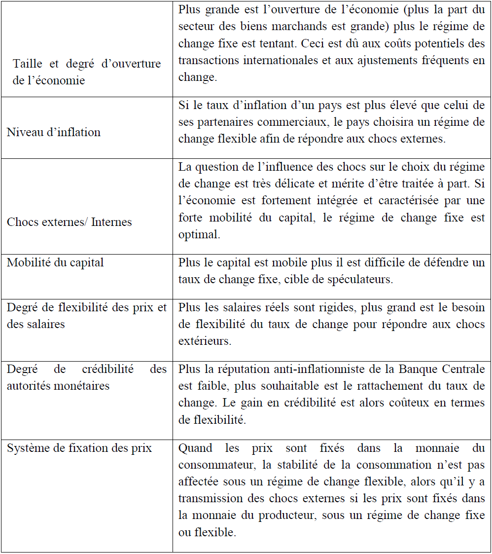 Tableau n°5: Les facteurs influençant le choix du régime de change