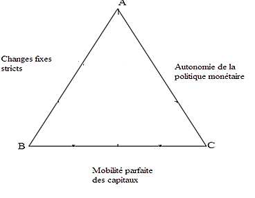 Dans ce triangle, les points A, B et C représentent respectivement l’autarcie financière, l’union monétaire et les changes flottants. Au point A (Autarcie financière), il est possible de concilier changes fixes et objectifs économiques internes si les réserves de change sont suffisantes. Au point B (Union monétaire), la mobilité parfaite des capitaux et les changes fixes interdisent toute autonomie à la politique monétaire. Quant au point C (changes flottants), la mobilité parfaite des capitaux et la flexibilité des taux de change permettent l’indépendance de la politique économique. En résumé, un pays ne peut maintenir simultanément des taux de change fixes et un marché des capitaux ouvert tout en poursuivant une politique monétaire tournée vers les objectifs économiques intérieurs.