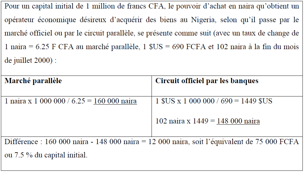 Les règlements des transactions à travers le marché officiel (les banques) empruntent des détours trop longs. Toutes les opérations qui passent par ce circuit sont libellées en dollars US, quelque soit l’origine ou la destination des produits. Beaucoup d’entrepreneurs hésitent à utiliser ce circuit, très couteux financièrement, tant du point de vue du prix des formalités que des détails de dénouement des opérations. En contrepartie de la relative sécurité que garantit le système décrit précédemment, le marché parallèle oppose la souplesse et la facilité d’accès aux devises de financement. Ce circuit est traditionnel dans le cadre des transactions entre le Nigeria et ses voisins, ce qui ne permet pas d’évaluer son ampleur. Ce sont les différences de coûts qui incitent de nombreux opérateurs à recourir au marché parallèle pour financer leurs transactions. En effet, il est plus intéressant pour un opérateur économique d’un pays de la zone franc de passer par le marché parallèle que par le circuit officiel. Par ce dernier circuit, il passe par trois monnaies : le franc CFA, le dollar et le naira qui, du fait du jeu des commissions prélevées par les cambistes, contribue à déprécier ses fonds. Le tableau n°8 montre, à travers un calcul simple comment le marché parallèle, en éliminant une devise, permet de gagner environ 7.5 % du fonds de roulement par rapport au montant auquel l’opérateur est en droit de s’attendre s’il passait par le circuit officiel.