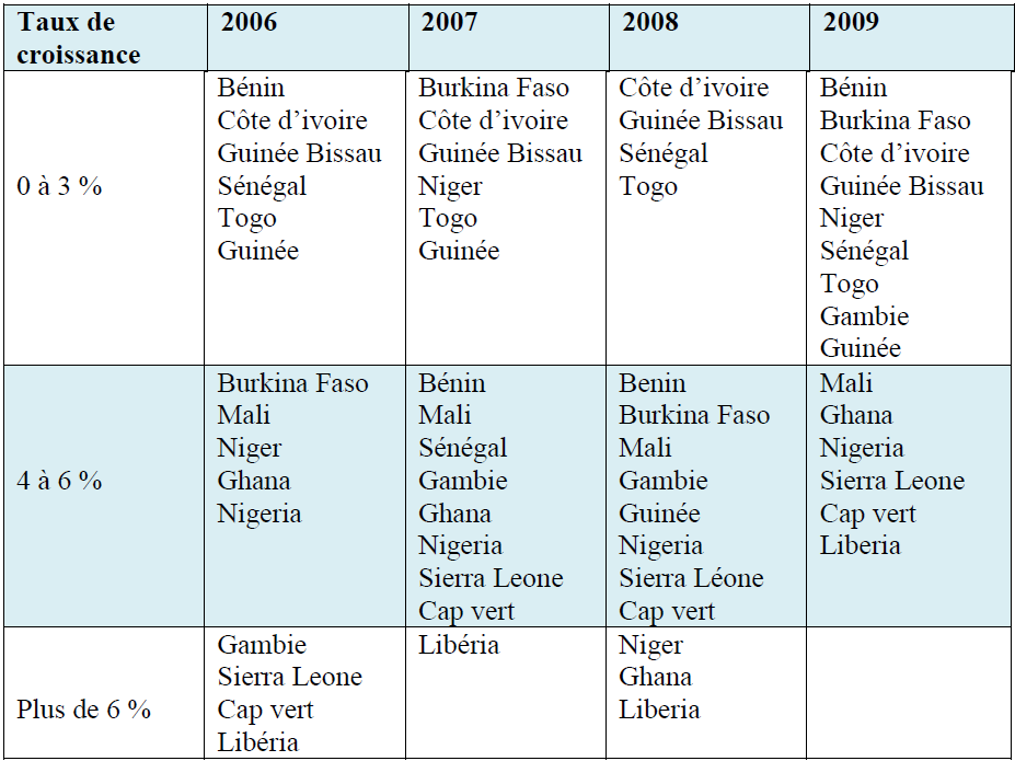 Selon le rapport économique sur l’Afrique 2011, la performance économique s’est améliorée dans la plupart des pays de l’Afrique de l’ouest en 2010. Il faut noter que suite à la crise financière de 2008, la croissance économique de la CEDEAO a connu une baisse, passant de 5,8 % en 2008 à 4,9 % 2009 (AMAO, 2010). Elle s’est effectivement améliorée en 2010, avec un taux qui avoisine les 6 %. Cette amélioration est due notamment à l’augmentation des prix et des revenus pétroliers ainsi que l’intensification de l’activité dans les secteurs de la construction (Ghana), la forte performance des secteurs agricoles et miniers (Sierra Léone) et l’augmentation des recettes provenant de l’exportation du caoutchouc (Liberia). La croissance du PIB s’est ralentie en 2010 dans la deuxième grande économie de la sous-région, la Côte d’Ivoire, passant de 3,7 % en 2009 à 2,4 % en 2010 (UEMOA, 2011). Cette baisse de la croissance est en partie due aux pénuries d’électricité et de l’incertitude politique qui a prévalu dans le pays avant et après l’élection de novembre 2010 (Rapport économique sur l’Afrique 2011). Le tableau n°6 montre que l’ensemble des pays de la CEDEAO ont eu une croissance instable sur la période 2006-2009.