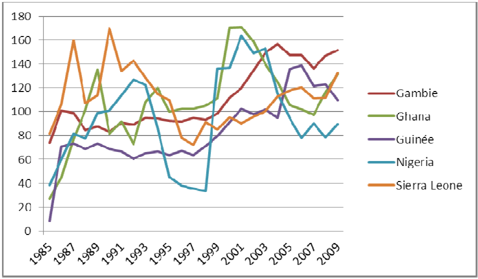 Pour les pays de l’UEMOA, on note une appréciation des taux de change effectifs réels,après une dépréciation brutale en 1994. Cela est la conséquence de la dévaluation de 1994, signed’une perte relative de compétitivité-prix des économies de l’Union. En effet, l’appréciation des TCER renchérît les prix des exportations des pays de l’union, ce qui se traduit par un déficit de la balance commerciale, conséquence de la perte de compétitivité des économies. Les TCER qui ont enregistré la plus forte augmentation par rapport à leur niveau de 1994 sont ceux de la Côte d’Ivoire (35%) et les appréciations les plus faibles étant celles du Mali (12%). En général, les taux de change réels de la zone ont progressé de 22% en moyenne (Kiema et al, 2011). On note ces dernières décennies que les pays tels le Nigeria et le Ghana occupent une place importante dans les échanges commerciaux de la zone. Toute modification dans la structure économique des ces pays peut avoir un impact sur l’évolution des TCER des pays de l’Union. Le taux de change utilisé dans ce graphique est exprimé au certain (5). Le graphique n°5 montre l’évolution du taux de change effectif réel des pays de la ZMAO.