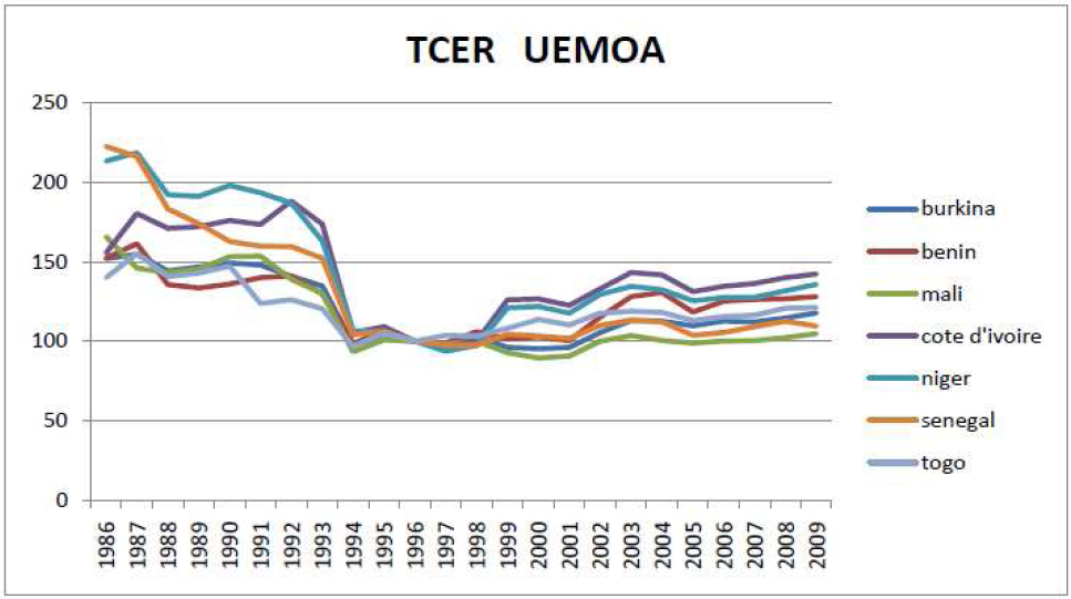 Les pays de la ZMAO ont opté ces dernières décennies pour les régimes intermédiaires et flexibles. Il faut noter une instabilité du TCER sur la période d’étude qui est due à la flexibilité du taux de change. Pour un pays comme la Guinée, marquée par une instabilité politique ces dernières décennies, il faut noter que la Banque Centrale manque d’indépendance et n’a pas pu résister aux pressions des hautes autorités de l’État visant à contourner le système de contrôle pour des paiements et des crédits de l’État. Selon le FMI (2008), la forte appréciation du taux de change réel de la Guinée est due en partie à la crédibilité accrue des changements structurels apportés aux politiques de change, l’anticipation d’allègement de la dette et d’amélioration des relations avec les créanciers, ainsi que les perspectives d’accroissement des exportations de produits miniers induits par les investissements de grande ampleur. L’appréciation généralisée des TCER dans la zone pose le problème de compétitivité-prix de celle-ci.