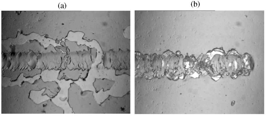Figure II.14. Rayures de revêtements WC obtenues par pulvérisation neutre (a) et réactive (b) après Scratch Test [35].