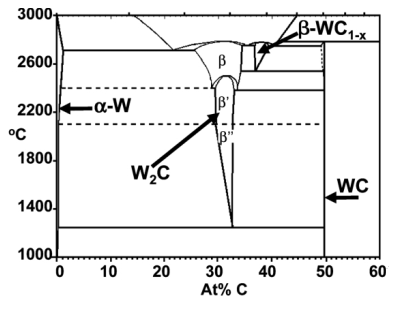 Le diagramme de phase montre que le mono-carbure α-WC est la seule phase thermodynamiquement stable dans le système W-C à température ambiante. Alors que les phases β-WC1-x où 0.34<x