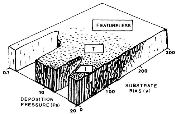 La croissance colonnaire des couches dépend du taux d’atomes déposés et l&²eurs taux de repulvérisation causé par la polarisation négative du substrat. Pour un taux d’atomes incidents, la suppression de la structure balistique requiert un taux minimum de repulvérisation. La tension de polarisation nécessaire pour atteindre ce seuil dépend de la densité du plasma entourant le substrat [26].