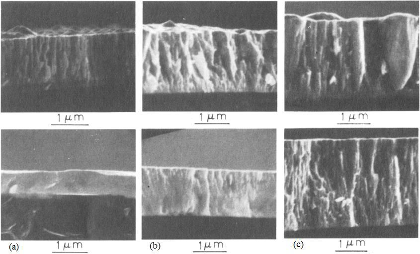 On constate à partir des recherches de la littérature que l’homogénéisation du revêtement peut être améliorée par de faibles puissances de décharge (figure II.15) [30]. Une étude par simulation numérique [42] montre que dans des conditions de faible taux de pulvérisation, des couches plus denses et homogènes sont obtenus par effet de la faible mobilité des adatomes sur la surface. Par augmentation de la puissance appliquée à la cible, la structure colonnaire des couches devient plus claire puisque le taux de croissance augmente simultanément avec le taux de pulvérisation [30].