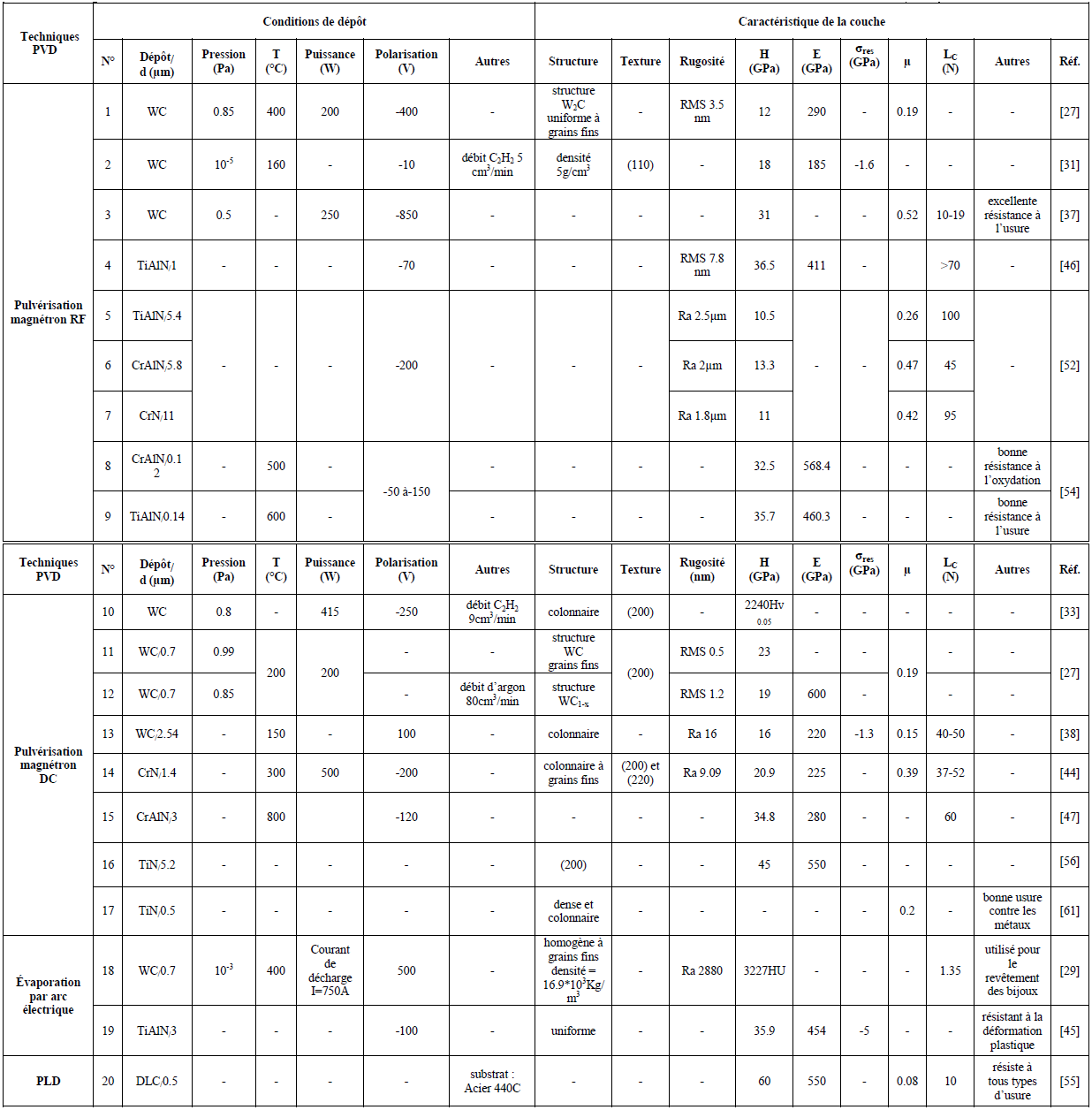 Pour conclure ce chapitre, je dirai que la recherche bibliographique que nous avons détaillée dans la dernière partie de celui-ci, apporte d’une part, une contribution à la compréhension des mécanismes complexes liés à la formation des dépôts de WC destinés aux applications mécaniques, et d’autre part, une intension à la sensibilité qu’exhibe leurs caractéristiques intrinsèques et surtout mécaniques envers les paramètres opératoires associés à leur mode d’obtention. Cette revue bibliographique nous a permis aussi de positionner le niveau de performance des revêtements en WC par rapport aux dépôts typiques de métaux de transition.