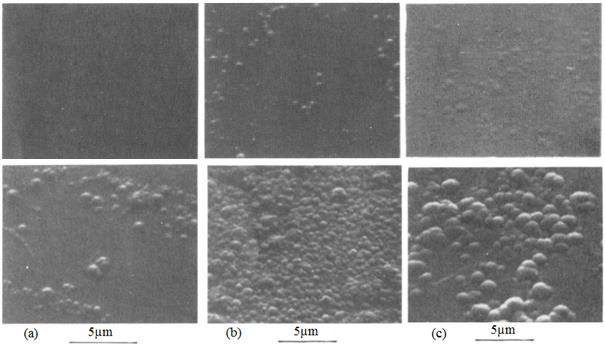Figure II.4. Topographies de surfaces de revêtements en WC par pulvérisation DC en haut et RF en bas, sous diverses tensions de polarisation [24], a) -400V, b) -200V, c) 0V.
