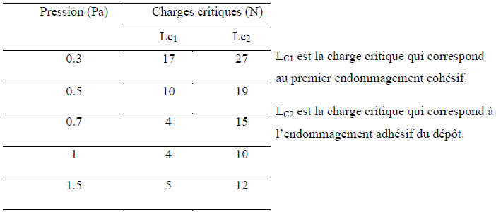 Le changement structural qu’entraine la variation de la pression de dépôt conduit éventuellement à la modification de l’accrochage de la couche au substrat. La ductilité qu’exhibent les couches élaborées à grandes pressions contribue à l’affaiblissement de leur adhérence. Les essais d’adhérence réalisés par A.Cavaleiro et al [37], sur plusieurs revêtements WC déposés à différentes pressions de dépôt sont reportés sur le tableau II.5. On constate que l’augmentation de la pression cause une diminution importante de la charge critique que peut supporter le dépôt.