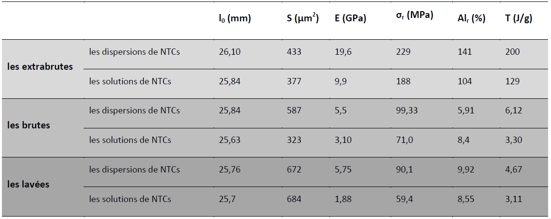 – Les fibres extrabrutes préparées à partir des dispersions de nanotubes de carbone présentent un module d’Young, une contrainte et un allongement à la rupture ainsi qu’une ténacité supérieurs à ceux des fibres extrabrutes préparées à partir des solutions.