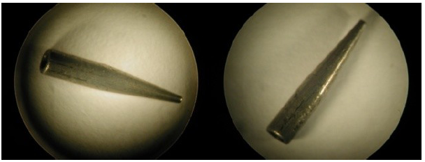 Figure 11 Clichés de la buse de filage (longueur  environ 1 cm, diamètre du conduit à l’extrémité 300 μm)