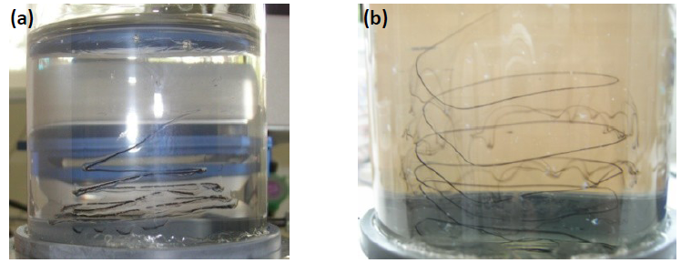 (a) Fibre composite NTC PVA dans de l’eau distillée (b) Séchage des fibres composites NTC PVA