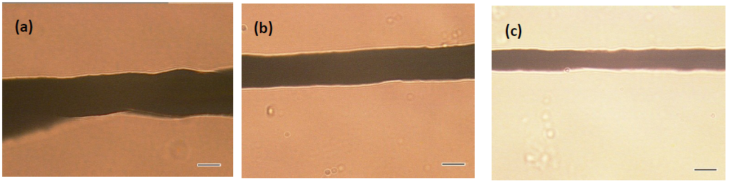On a observé au microscope optique trois sortes de fibres préparées dans les mêmes conditions de filage c’est-à-dire avec un débit de la seringue de 50mL/h et une vitesse de la tournette de 50trs/min (figures 14(a), figures 14(b) et figures 14(c)).