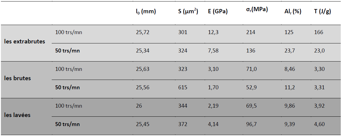 – Les fibres extrabrutes filées à 100 trs/min sont plus fines que celles filées à 50 trs/min. Elles présentent un module d’Young, une contrainte et un allongement à la rupture ainsi qu’une ténacité supérieurs à ceux des fibres filées à 50trs/min.