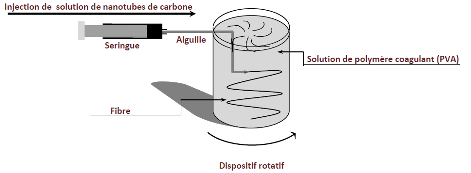 Le procédé de filage schématisé dans la figure 10 consiste à injecter la solution (dispersion ou solution polyélectrolyte de nanotubes de carbone) réalisée préalablement à l’aide d’une seringue munie d’une aiguille, dans un flux de polymère coagulant, ici le poly (vinyl alcool) (PVA).