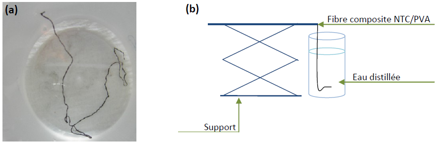 Figure 12 : (a) Fibre composite NTC/PVA dans de l’eau distillée, (b) : Séchage des fibres composites NTC/PVA