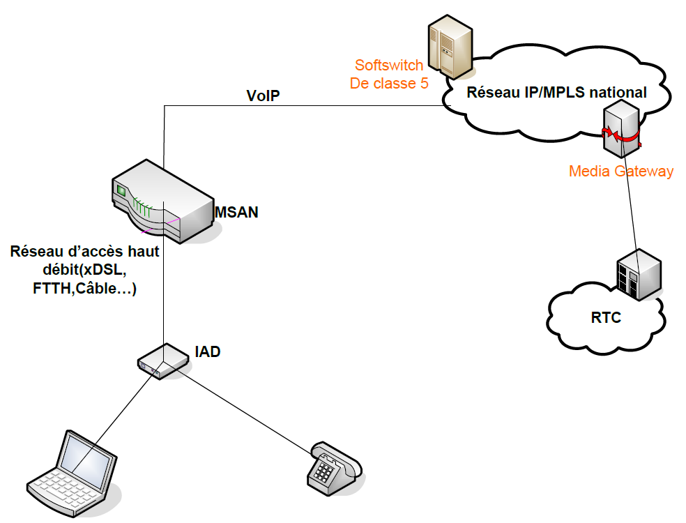 L’opérateur remplace ses commutateurs locaux TDM par des softswitchs de classe 5. A la différence des solutions de classe 4, les serveurs d’appels de classe 5 peuvent supporter tous les types de services proposés par les commutateurs traditionnels locaux et servir tous les types de terminaux raccordés au réseau IP, directement ou par l’intermédiaire de MSAN («MultiService Access Node »), (voir figure 12).