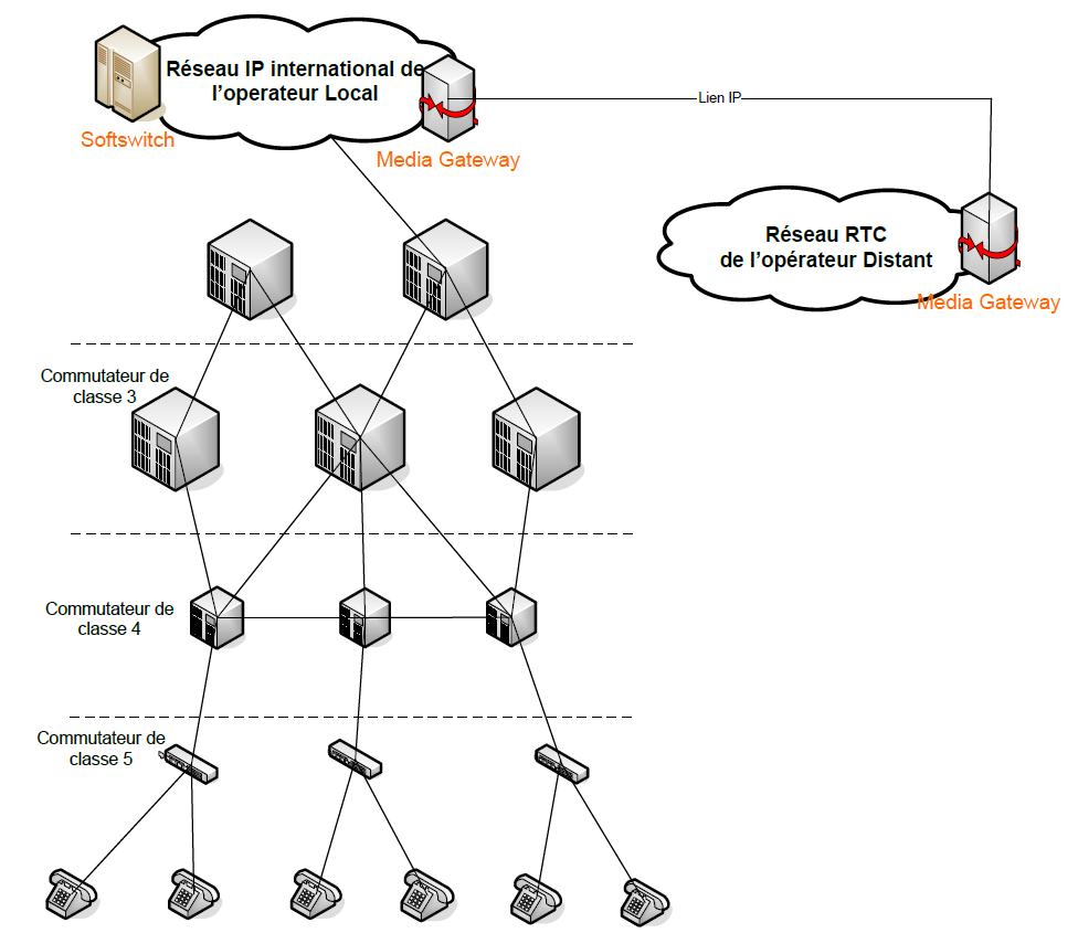Au niveau national, l’approche est similaire sauf que ce sont les commutateurs de classe 3 et de niveau hiérarchique supérieur qui seront remplacés par un ou plusieurs softswitchs et passerelles medias.