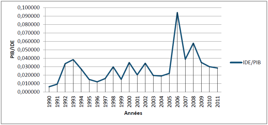 Un taux de 0,6% en 1990 de la croissance de (IDE/PIB), a évolué en 2006 et 2008 pour atteindre respectivement 9,42% et 5,89.