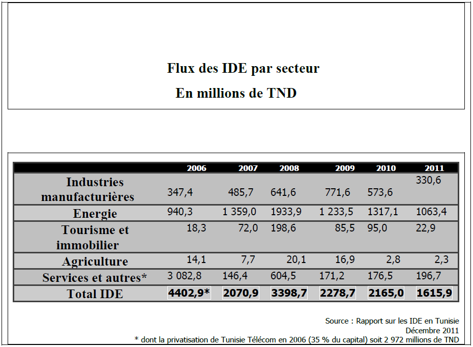 Source : Rapport sur les IDE en TUNISIE Décembre 2011.