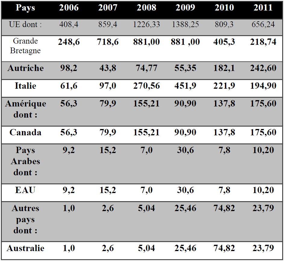 Une répartition des IDE par pays d’origine (tableau 5) montre une prédominance de la Grande Bretagne entre 2006 et 2010 qui enregistrent un taux de croissance de 63,03% pour un volume globale 2341,5 millions de TND. Concernant les pays Arabes, l’Emirats Arabes Unis prend la première place avec un taux de croissance de 10,86%.