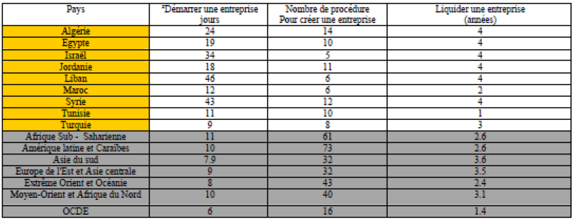 Le tableau ci-dessous donne une idée sur le nombre de procédure à accomplir pour investir dans les pays Méditerranéen.