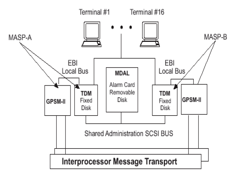 – La carte MDAL, qui est un double slot, constitue le système de sauvegarde interne. Elle donne l’état des MASPs par contrôle et distribution des alarmes, et supporte le disque optique (Optical Disk Magnetic). Ces deux MASPs sont reliés aux cartes d’extension par un bus appelé IMT (Interprocessor Message Transport).