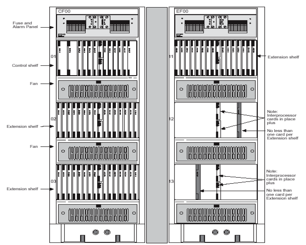 – La baie d’extension (EF, Extension Frame), étant constituée de trois (3) alvéoles (shelves) séparés par un système d’aération électrique, cette baie est utilisée pour augmenter la capacité des liens de signalisation en ajoutant des cartes.