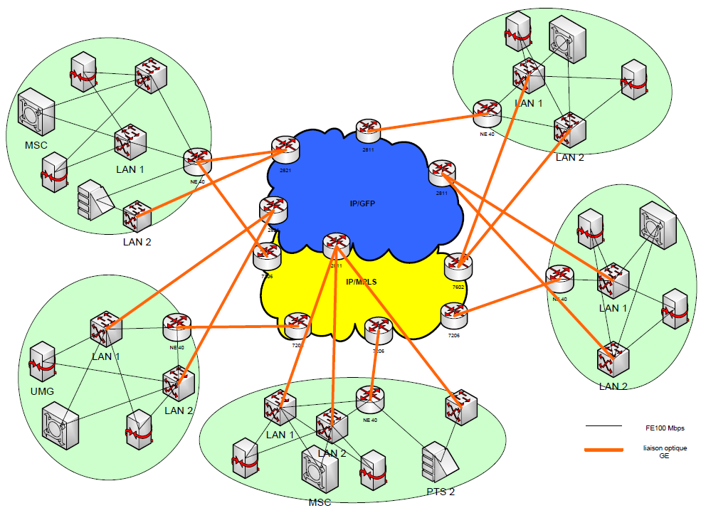 Le réseau de transmission IP/GFP a des liens 34Mbits et 155Mbits sur SDH. Il est constitué par des routeurs CISCO 2821 et 2811 interconnectés avec ces liens en fibre optique. Il est le réseau dédié ou primaire pour la transmission de la signalisation. Le protocole de routage OSPF est utilisé pour la propagation des routes vers les différents noeuds.