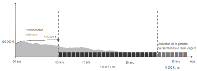 Chaque année, l’assuré recevra un complément de revenu garanti. Ce complément sera calculé à partir des tables de mortalité sur le principe d’une rente viagère immédiate. Certain contrat ont une garantie «cliquet périodique» qui permet, en cas de forte hausse des marchés financiers, de revaloriser définitivement le montant des compléments de revenu.