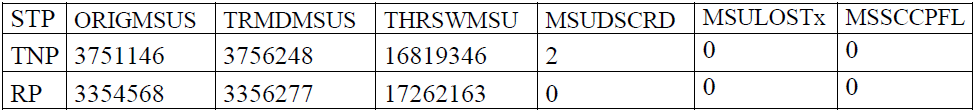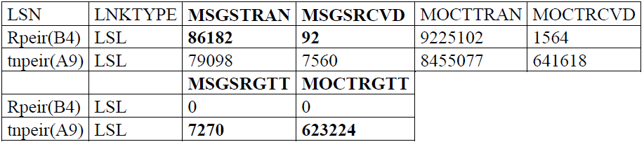 En observant les liens vers le STP de RP nous apercevons que les MSUs transmis vers le end point sur ce lien ne sont pas traités correctement à cause des erreurs omniprésents sur la couche MTP. Les Messages de la couche application (ISUP/SCCP) ne parviennent totalement pas le STP afin d’être traité. Au niveau du compteur MSGSRCVD du lien congestionné n’affiche pas beaucoup des messages reçus à cause des erreurs de la couche MTP.