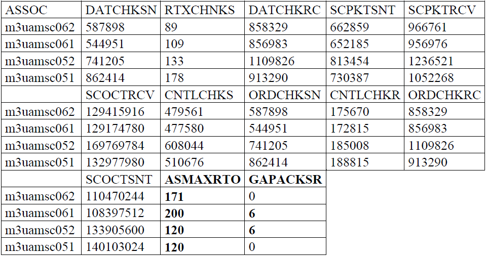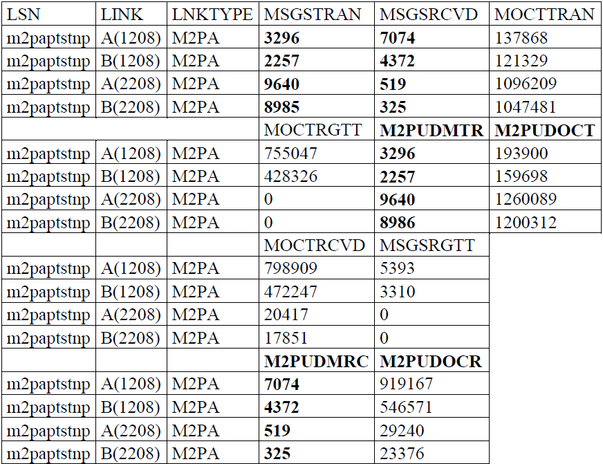Dans ce tableau sont affichées les valeurs de compteurs des quatre liens M2PA entre les deux STP. Les MSUs qui transitent sur ces liens sont les messages venant de la couche utilisateurs et qui traversent la couche M2PA pour être transmis vers le réseau IP par le protocole SCTP. Les paramètres inclus dans ce tableau sont détaillés dans l’annexe B. La colonne LSN signifie le nom du faisceau et LINK indique le numéro de la carte et le port où le lien est configuré. Dans le chapitre précédent sur le paragraphe II.2.1 il a été déjà dit que la couche M2PA assure le transport de paquets MTP3 entre deux SGs ou deux IP SPs (IP SIGnaling Point). Elle fournit une interface MTP 2 à la couche cliente (à savoir, MTP3) et s’appuie sur le service SCTP, alors dans ce tableau les paramètres (M2PUDMTR, M2PUDMRC, M2PUDOCT et M2PUDOCR) présentent successivement les unités de données (chunks) reçu dans M2PA et transmis de M2PA.